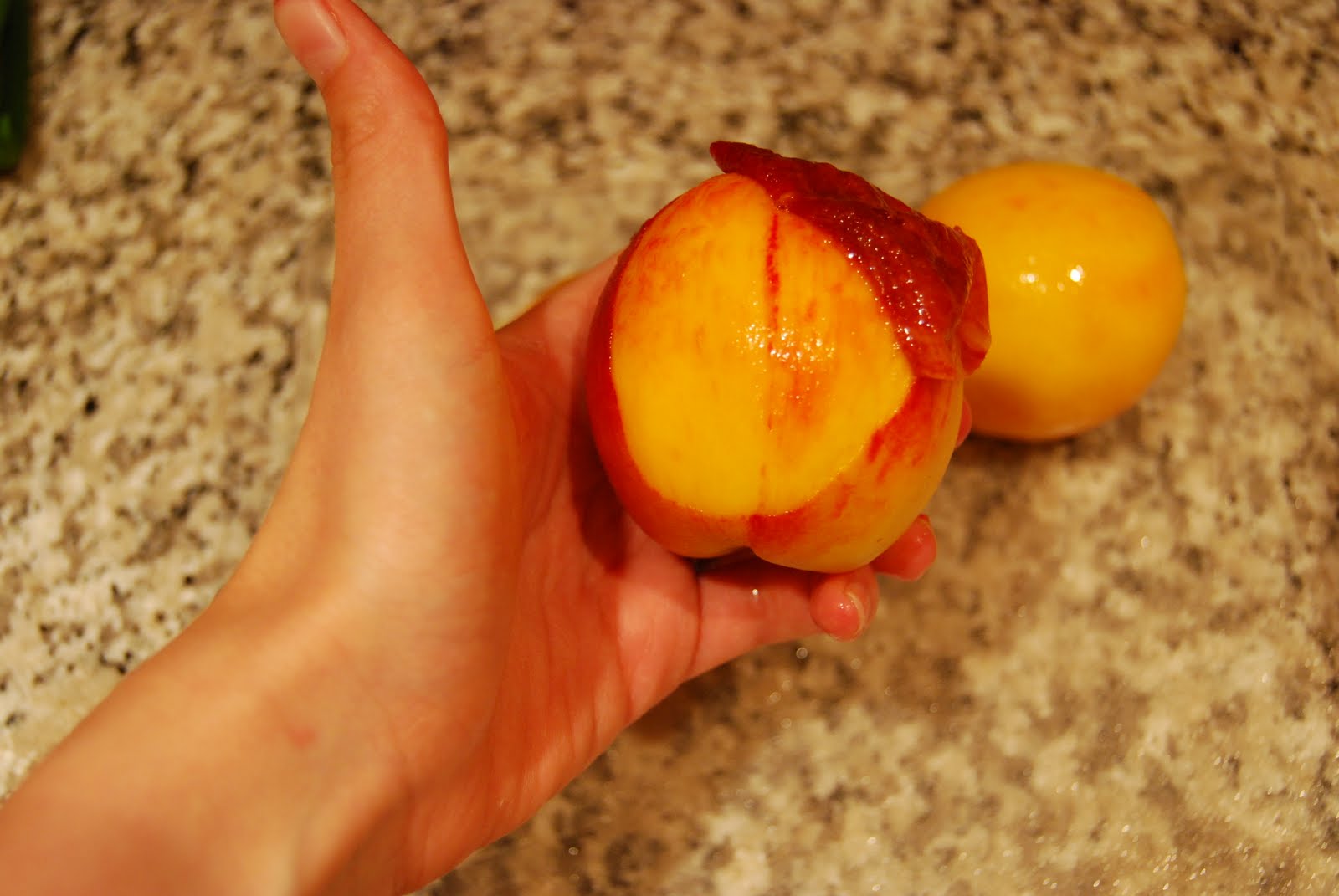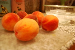 To remove the fuzzy skin – I boiled a small pot of water and dunked the peaches in the boiling water on the stove for about 15 seconds. After their spa experience they all get dunked in a bowl of ice cold water so that they don’t continue cooking. At this point the skin peels right off.