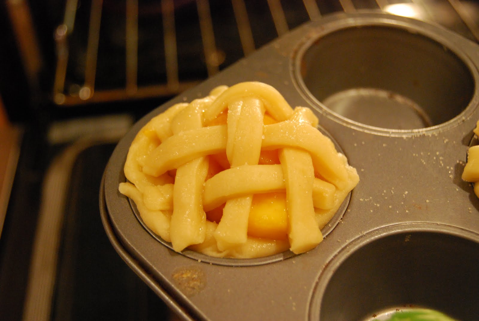 With the excess dough I cut out little strips and made a mini lattice for the tops. With my fingers I rubbed a bit of skim milk, but you could use an egg wash or water in a pinch, and sprinkled some raw sugar on top.