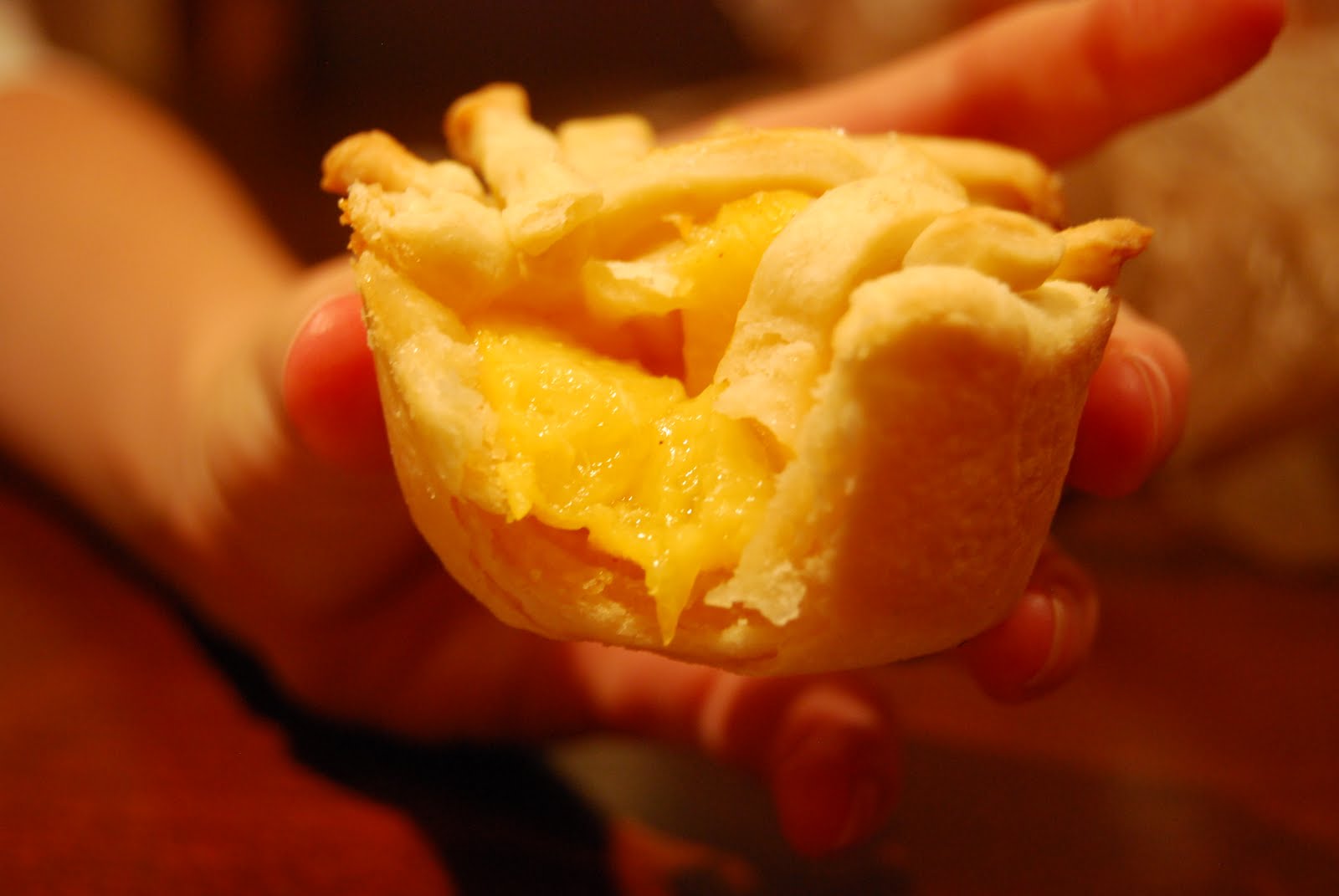 I use a muffin tin as the pie pan and a juice glass to cut out the circles. The pan doesn’t need any additional grease as the dough is already pretty deliciously buttery.