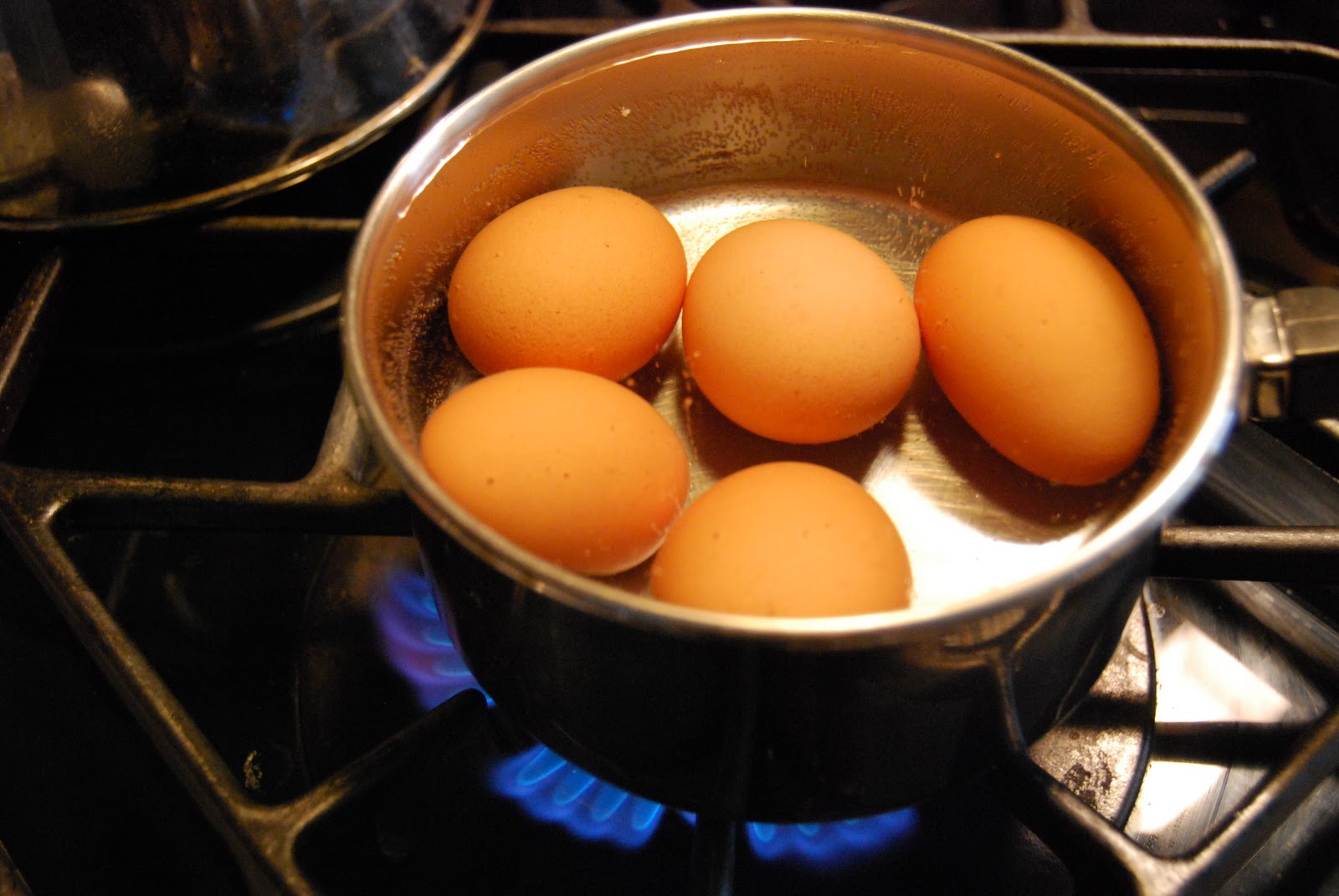 2. As soon as water starts to boil, turn off heat, and let eggs sit for 10 minutes
