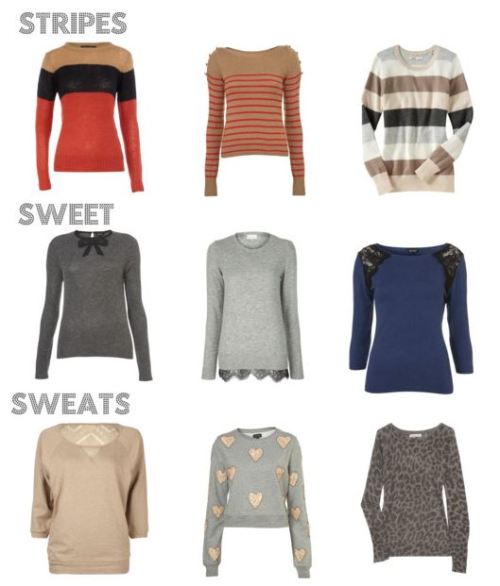 Be ready for anything but the gym in sweaters inspired by sweats. I am enrolling in Fashion Ed. as opposed to Phys. Ed. and embracing the easy fit of a sweatshirt with the added embellishments and details that make it fashion. Still here: ribbed cuffs, hems, and vent stitching at the collar. Gone are the oversize silhouettes, and anything resembling a Hanes Beefy anything. In its place is delicate stitching, sequins, and playful patterns. Find the right slim fit, too big and bulky you might as well wear sweats. Tip: Look embellishment that is delicate, the emphasis here is playing with opposites.Shop: Cropped, Hearts, Spots