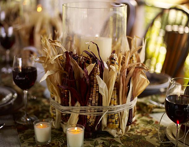 From pottery barn, this is a simple hurricane candle holder wrapped with dried maze and tied with twine. It probably take no more than minutes to assemble but makes a very pretty visual impact.