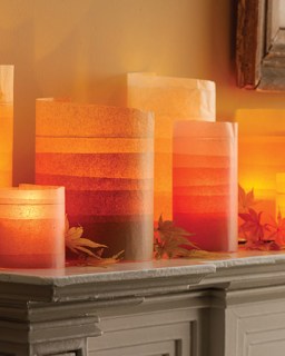 For a crafty decor idea there is nothing easier than this for the mantle: take candle holders/vases that you already own and wrap with pretty paper and secure with a double stick tape. An illuminated candle inside gives this idea an ever brighter glow.