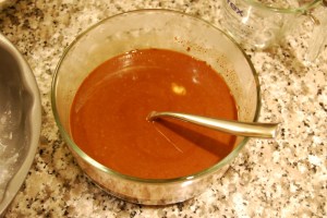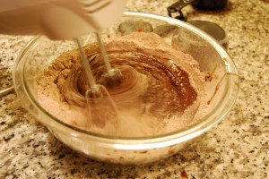In a separate bowl combine flour, hot chocolate powder, baking soda and salt and gradually blend in the chocolate soup.