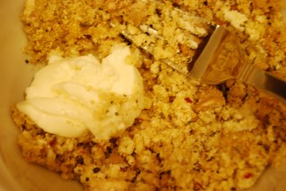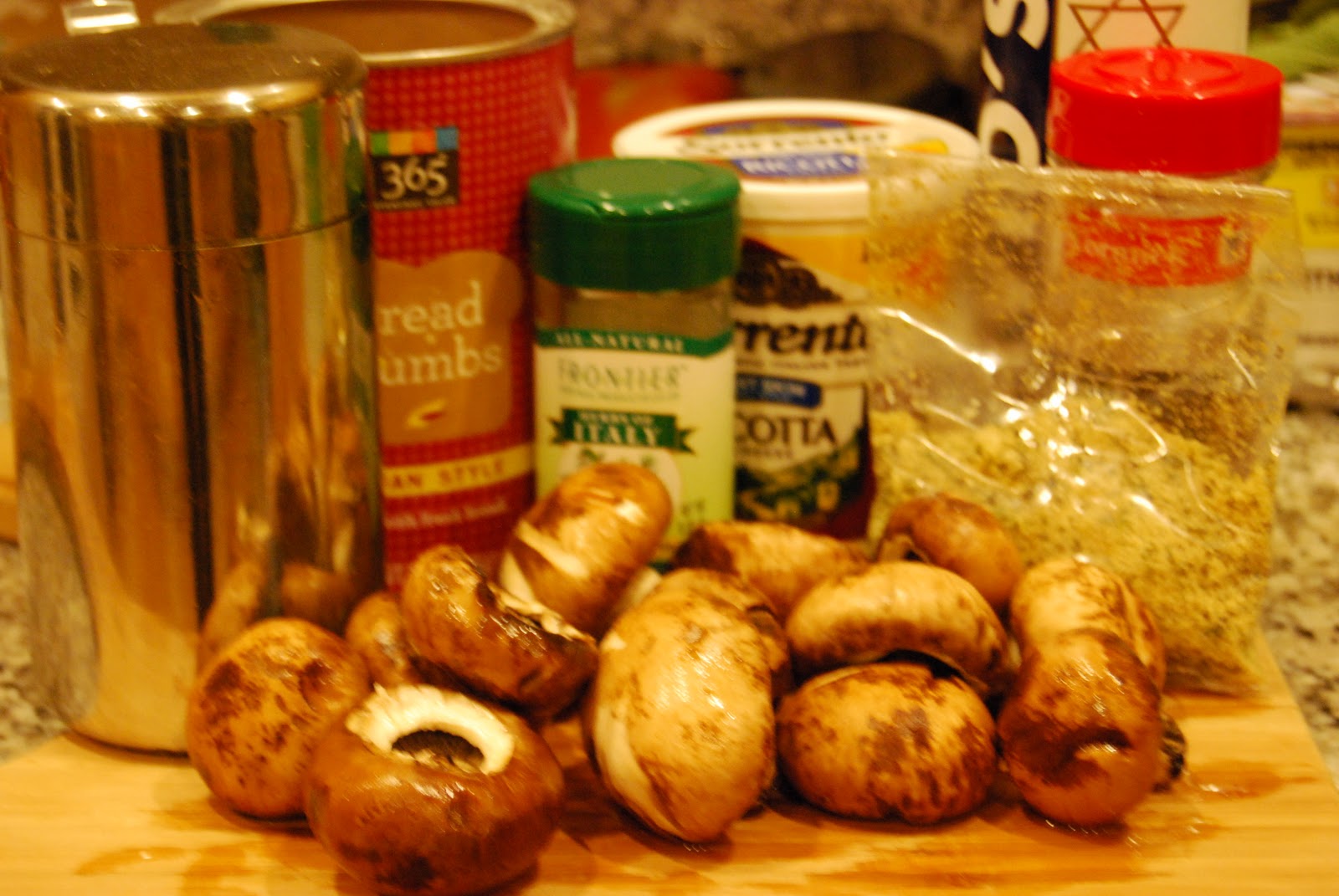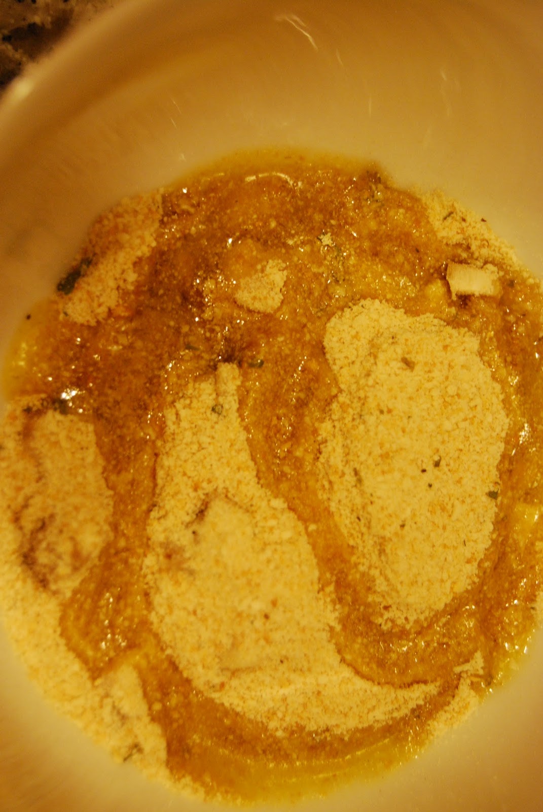 In a small bowl add all of the seasonings, cheese, bread crumbs and olive oil.  Add to that the chopped mushrooms.