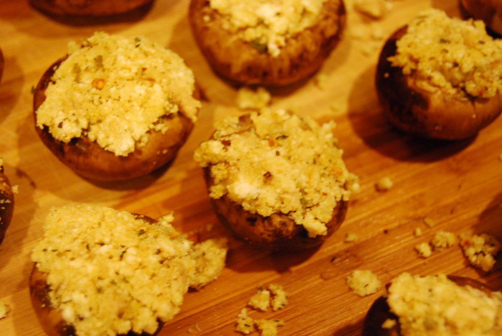 Prepare the oven to 400 degrees and put parchment paper on a cookie sheet.  Turn the mushrooms cavity down and lightly oil the outside of the mushrooms, and sprinkle to taste with salt and pepper.  With a small spoon, or of course your fingers, stuff the mushrooms to the top.