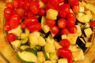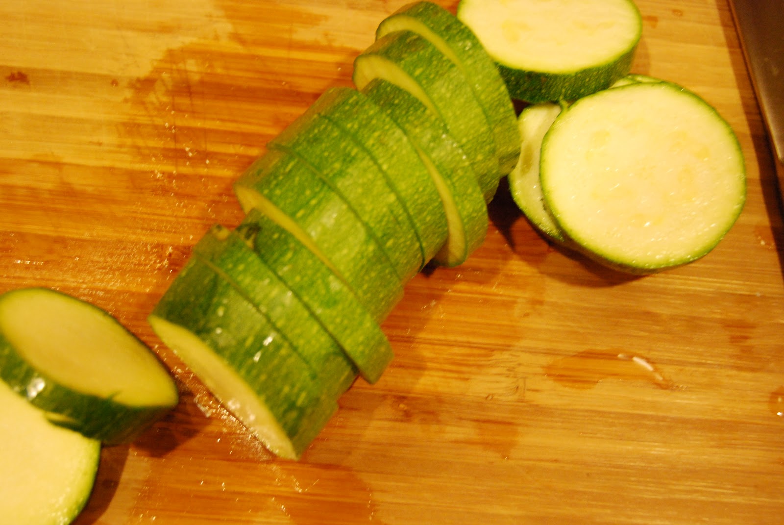 First prepare the zucchini, this is the most time consuming element so you might as well get it out of the way early. Chop the head and “butt” of the zucchini off and with a fruit peeler peel down the length of the zucchini revealing thin strips the width of the vegetable. Set aside.