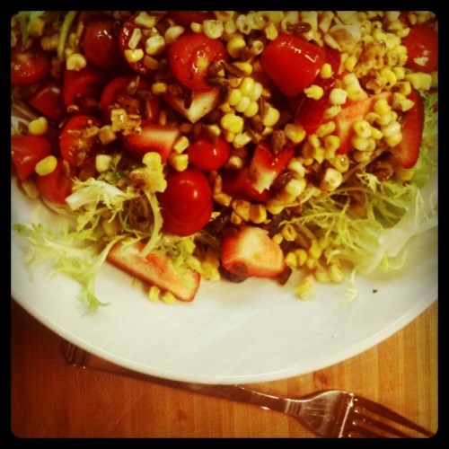 Frisee – I know this isn’t the salad green that most people gravitate towards but, this branchy leaf has the right amount of bite to stay strong with the fruits and vegetables that would typically overwhelm spinach or arugula. If you can’t get down with the frisee, I think a crisp romaine could also do the trick.